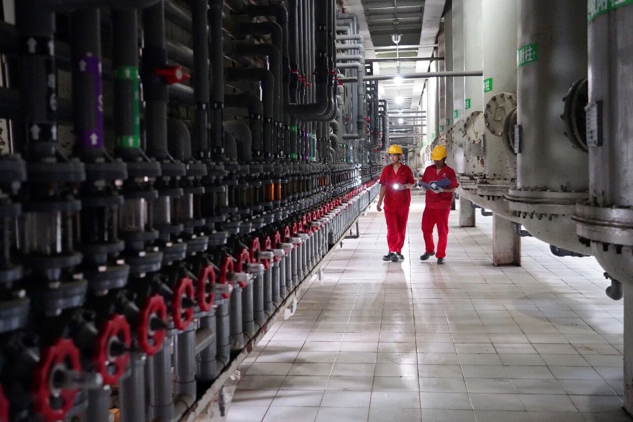 甜菊糖精制車間員工在巡崗。